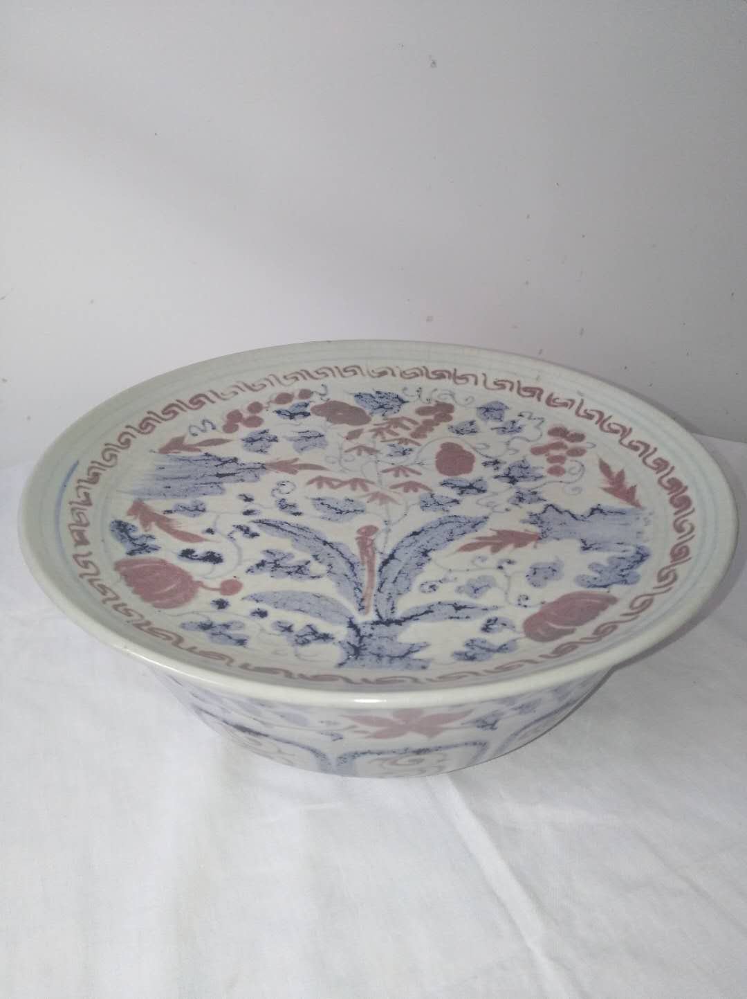 《元未明初青花釉里红山石瓜果纹孔明碗,高12.3,口29.8,底13.3》