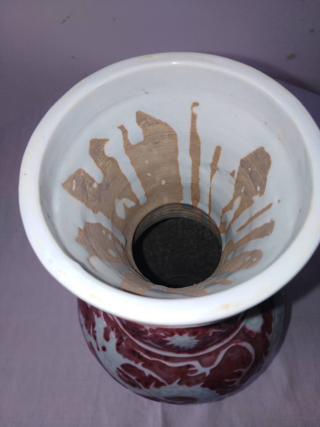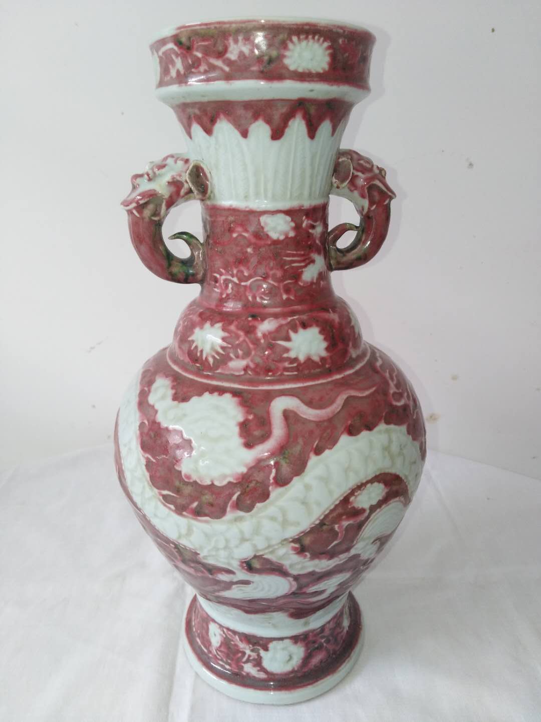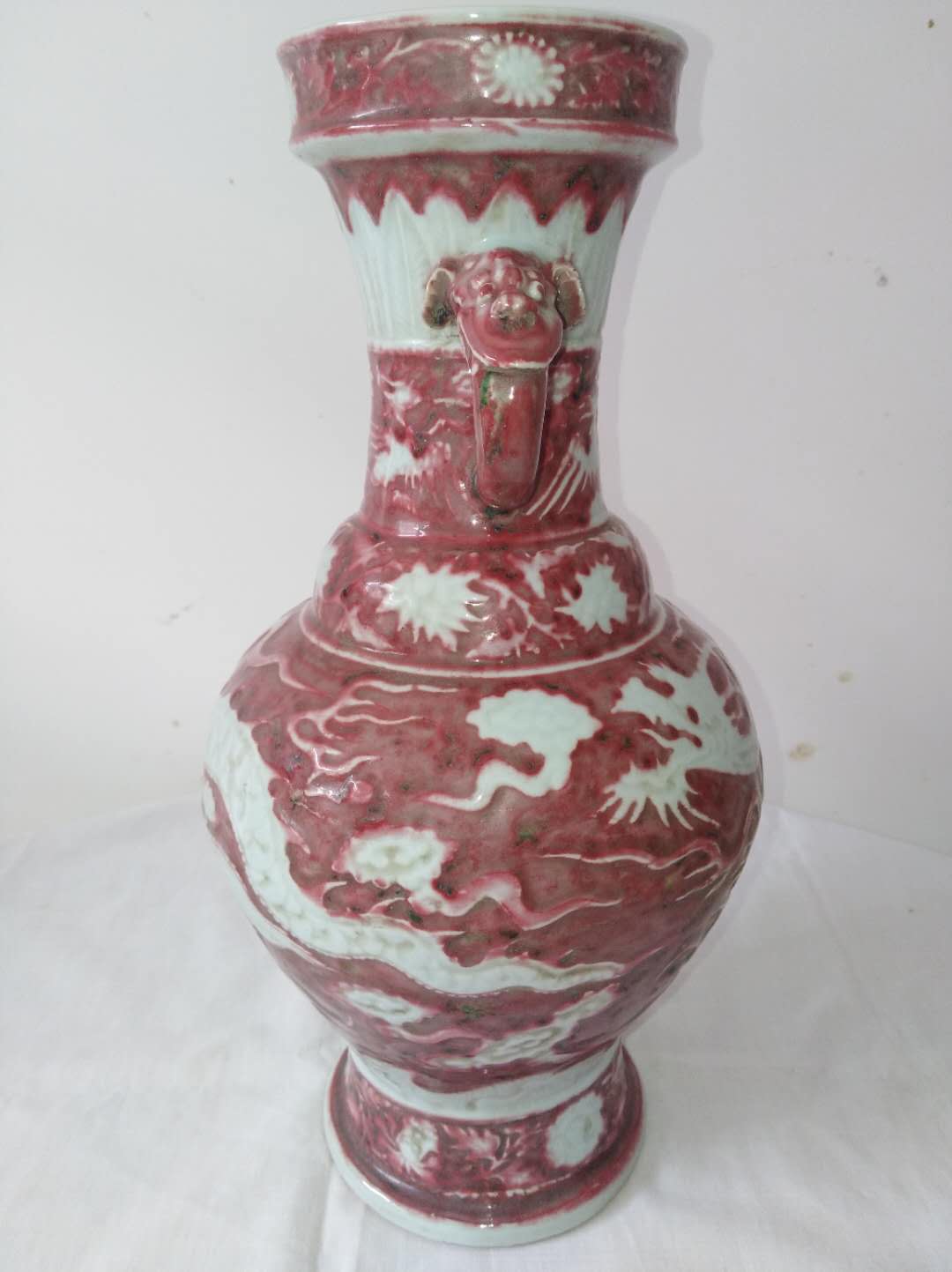 元末明初釉里红瓷器在烧造上要比青花瓷器难得多,因为釉里红在烧造过程温度要求非常严格(温差在10度左右)所以造成成品率很低,存世量比青花要少得多。此件釉里红刻花龙凤纹象耳尊,从工艺上,釉面刻画修胎及器型各方面分析都符合这个时期特点,釉质温润,包浆厚重,老旧痕迹及烧制形成的火石红明显,用手抚摸釉面高低不平,釉层肥厚十分光滑,刻画龙纹张牙舞爪,非常开门,藏友能收藏到一件这样完美的釉里红瓷器精品实为难得。转让价:360万