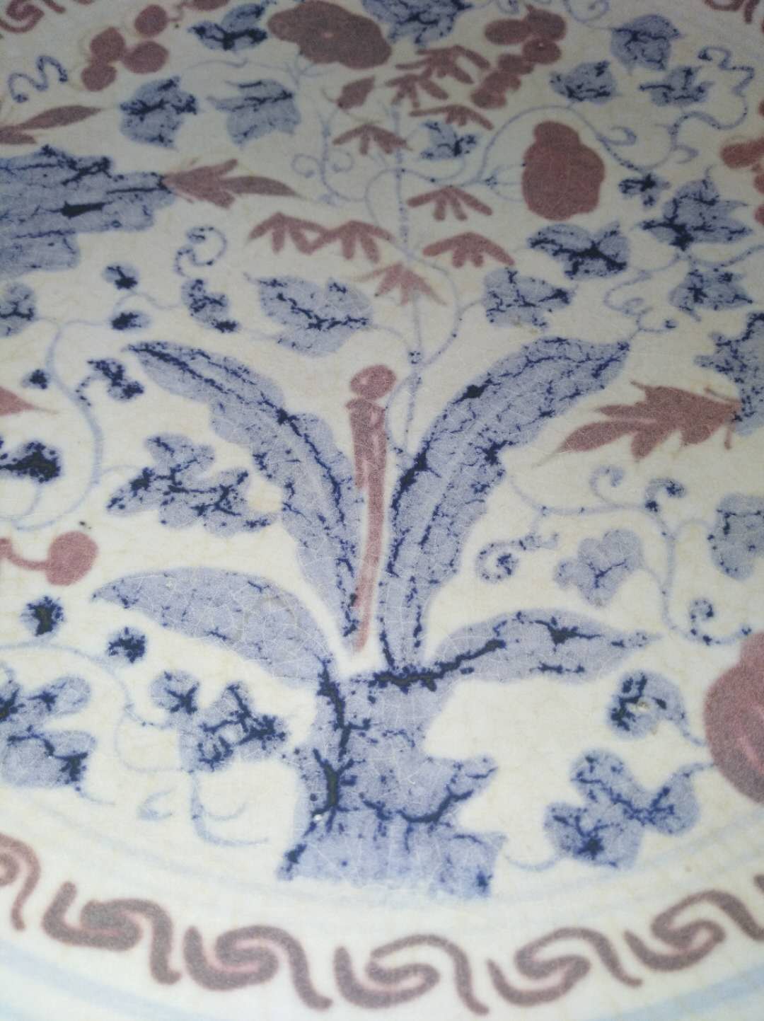 元青花器物已是全世界爱好收藏的人梦寐以求的藏品,由于它的稀少而受大家的追求,青花釉里红更是少之又少,因它的烧造难度非常之高,青花与釉里红在一器物上同时烧造因温差非常大(青花1300度釉里红1000内)很难烧成成品。这件青花釉里红孔明碗的成功烧造已是奇迹,青花料是用进口纯正的苏麻离青绘画枝叶山石,色泽浓艳并有黑褐色的斑点下凹深入胎骨,手抚摸可辨凹凸不平之状,瓜果用釉里红涂绘,红兰色交相辉映具有极强的装饰效果,在青花釉里红瓷器中极为少見,当为馆藏重器,实为难得的收藏瑰宝升值空间非常之大。转让价:400万